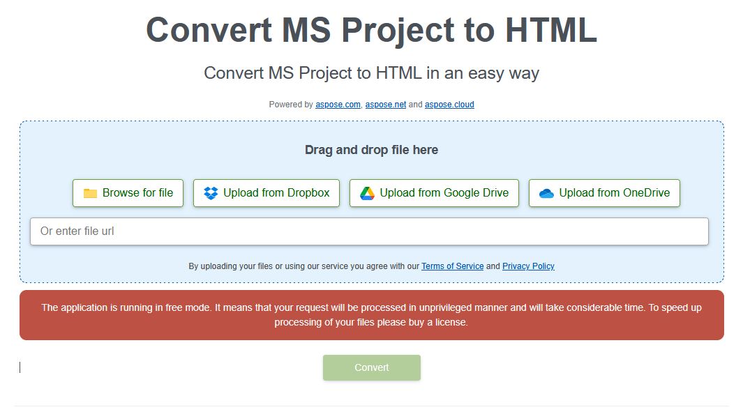 Aspose.Tasks Cloud SDK for Node.js يوفر واجهة برمجة تطبيقات قوية لإدارة وتحويل ملفات Microsoft Project. واحدة من ميزاته القوية هي القدرة على تحويل ملفات MPP إلى صفحات HTML تفاعلية - مثالية لمشاركة تحديثات التقدم وآراء المشروع عبر الإنترنت.