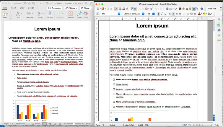 Microsoft Word documents ინტენსიურად გამოიყენება, მაგრამ როდესაც საქმე ეხება ღია წყაროების პლატფორმებს ისეთში, როგორიცაა LibreOffice, ან ცვალებადი პლატფორმების თავსებადობას, Word დოკუმენტების OpenDocument Text (ODT) ფორმატში გადაყვანა აუცილებელი ხდება. ODT ფორმატი იდეალურია გრძელვადიანი დოკუმენტების შენახვის, ღია სტანდარტების შესაბამისობისა და ხელმისაწვდადობისათვის.